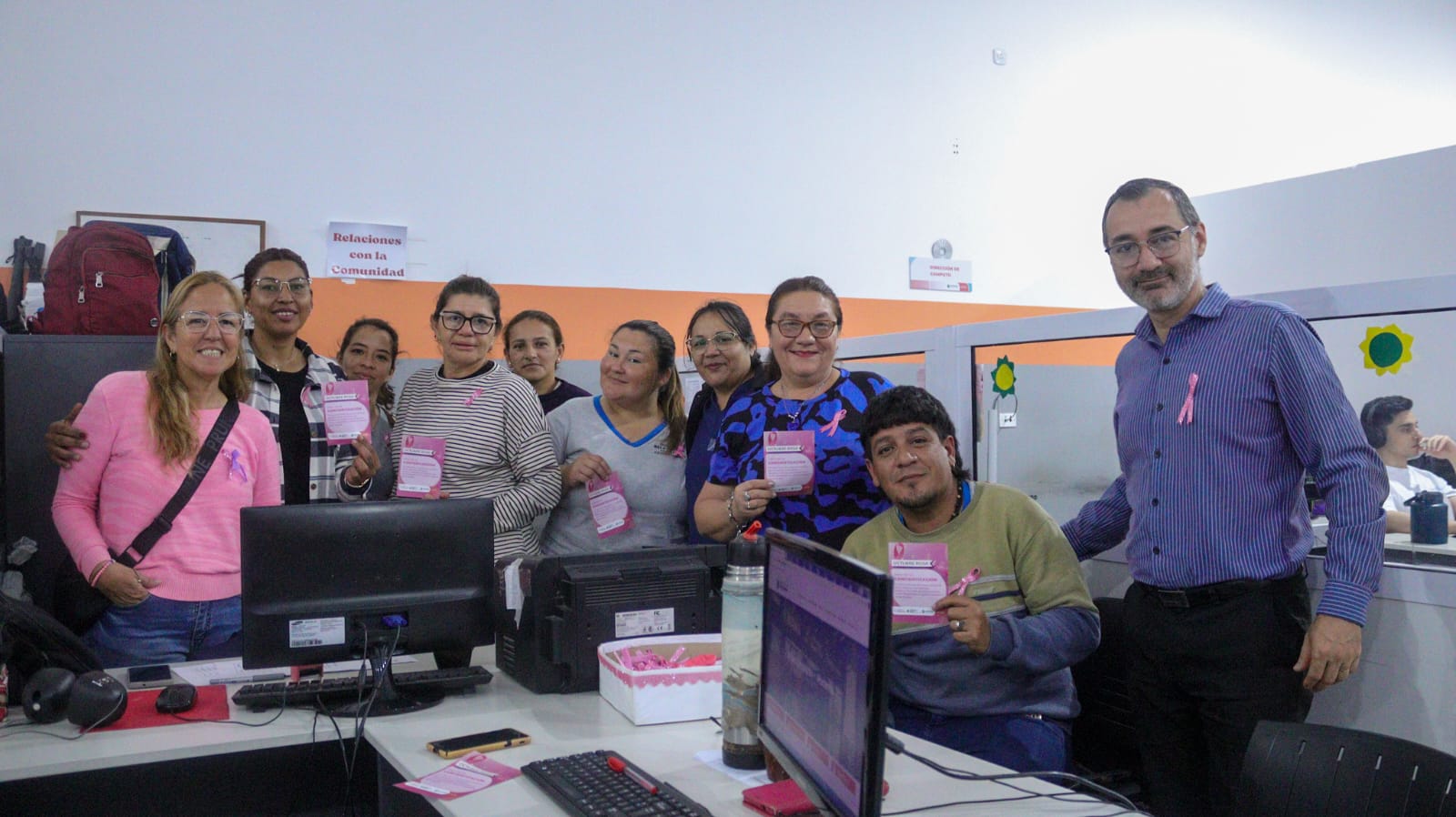 Durante la actividad, se realizó la entrega y colocación de lazos, que representan palabras de apoyo y mensajes positivos hacia todas nuestras luchadoras, como símbolo de acompañamiento y esperanza. Además, se acercó a los trabajadores municipales la posibilidad de gestionar turnos automáticos para mamografías, ecografías mamarias, ecografías ginecológicas y ecografías prostáticas, promoviendo de esta manera el acceso a los controles preventivos.